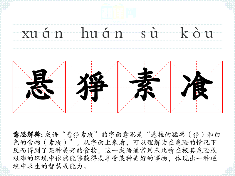 成语“悬猙素飡”的字面意思是“悬挂的猛兽(猙)和白色的食物(素飡)”。从字面上来看,可以理解为在危险的情况下反而得到了某种美好的食物。这一成语通常用来比喻在极其危险或艰难的环境中依然能够获得或享受某种美好的事物,体现出一种逆境中求生的智慧或能力。