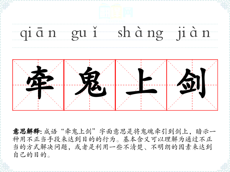 成语“牵鬼上剑”字面意思是将鬼魂牵引到剑上,暗示一种用不正当手段来达到目的的行为。基本含义可以理解为通过不正当的方式解决问题,或者是利用一些不清楚、不明朗的因素来达到自己的目的。