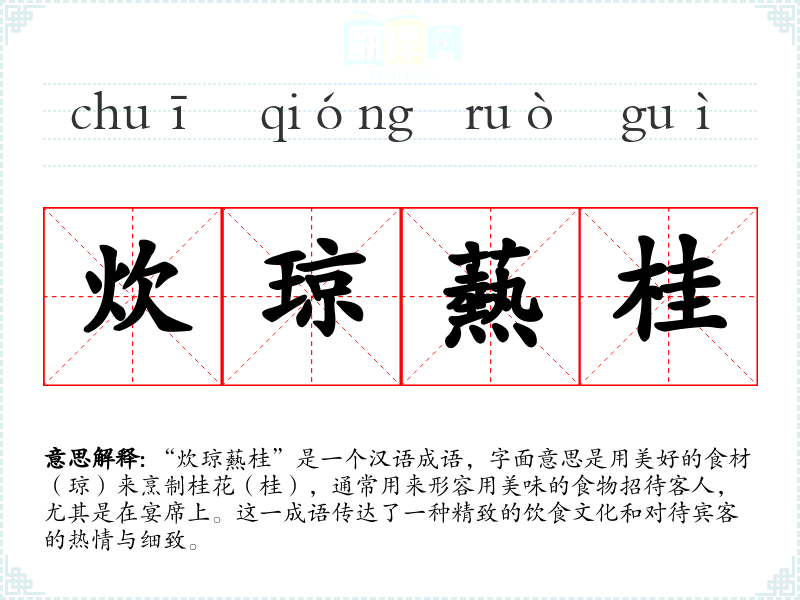 “炊琼爇桂”是一个汉语成语,字面意思是用美好的食材(琼)来烹制桂花(桂),通常用来形容用美味的食物招待客人,尤其是在宴席上。这一成语传达了一种精致的饮食文化和对待宾客的热情与细致。