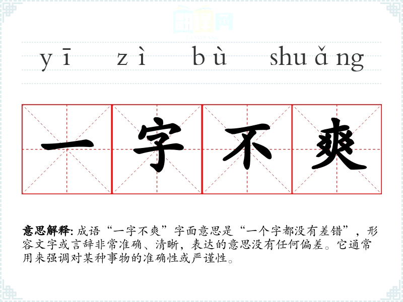 成语“一字不爽”字面意思是“一个字都没有差错”,形容文字或言辞非常准确、清晰,表达的意思没有任何偏差。它通常用来强调对某种事物的准确性或严谨性。