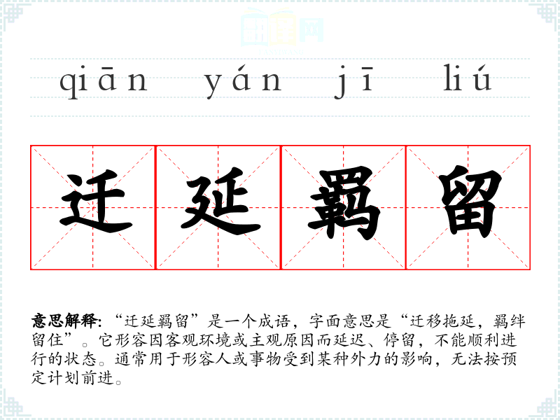 “迁延羁留”是一个成语,字面意思是“迁移拖延,羁绊留住”。它形容因客观环境或主观原因而延迟、停留,不能顺利进行的状态。通常用于形容人或事物受到某种外力的影响,无法按预定计划前进。