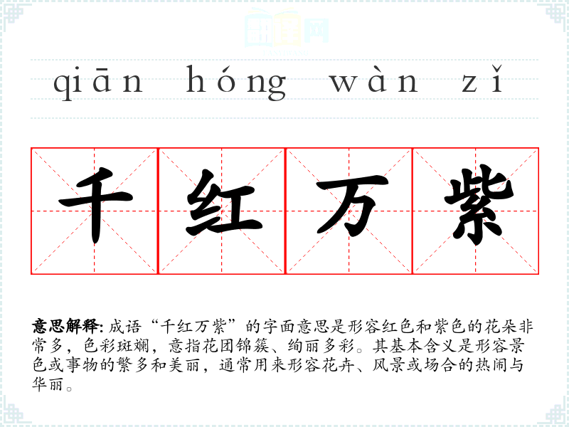 通过对“千红万紫”的学,我不仅加深了对这个成语的理解,也领悟到语言的美与表达的力量。在我的语言学中,这个成语让我意识到用生动的比喻和形象的表达方式,可以更好地传达情感与景象。