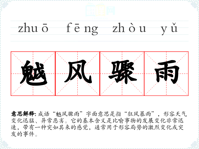 - 同义成语:风云突变、骤雨狂风。这些成语都强调变化的迅速和剧烈程度。