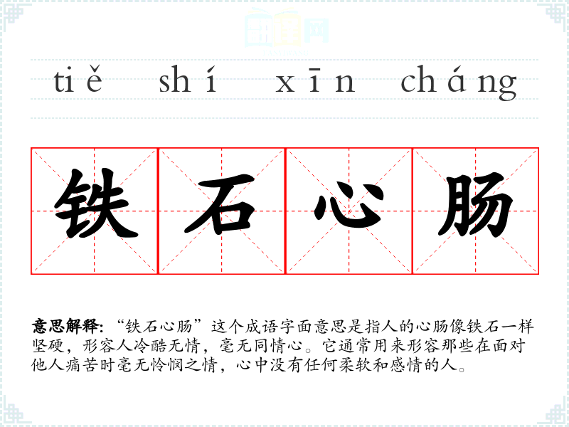 “铁石心肠”这个成语字面意思是指人的心肠像铁石一样坚硬,形容人冷酷无情,毫无同情心。它通常用来形容那些在面对他人痛苦时毫无怜悯之情,心中没有任何柔软和感情的人。