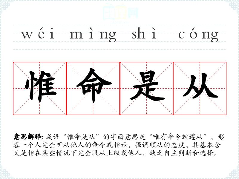 - 同义成语:遵命、听从、随声附和。这些成语都表达了顺从的意思,但“惟命是从”更强调对命令的绝对服从。