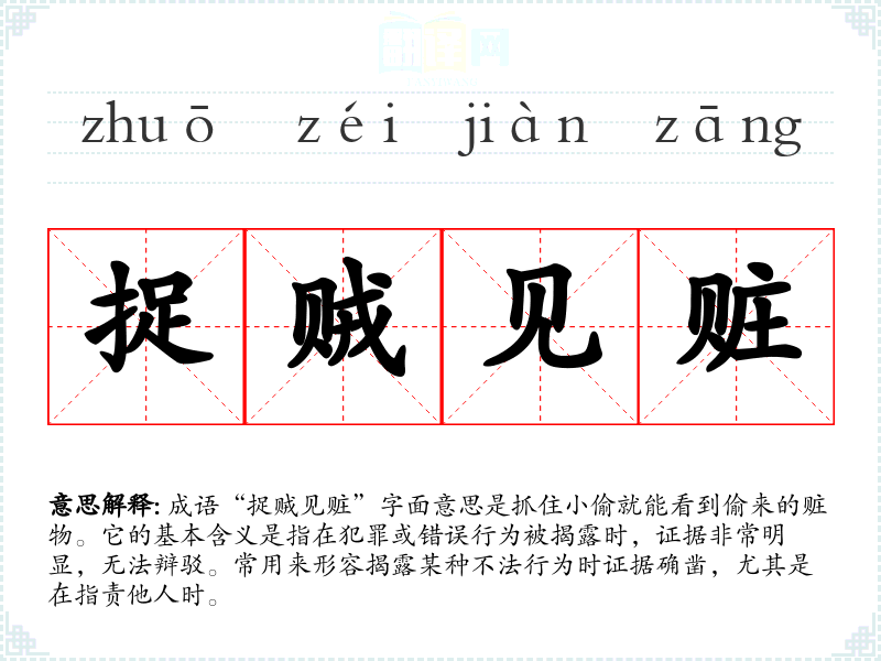 在**传统文化中,正义和法律被视为重要的社会基石。“捉贼见赃”体现了社会对不法行为的零容忍态度。在现代社会,该成语仍然适用,尤其在法律、道德和诚信的讨论中,更能引起共鸣。