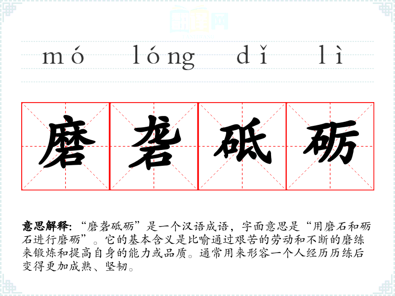 “磨砻砥砺”是一个汉语成语,字面意思是“用磨石和砺石进行磨砺”。它的基本含义是比喻通过艰苦的劳动和不断的磨练来锻炼和提高自身的能力或品质。通常用来形容一个人经历历练后变得更加成熟、坚韧。