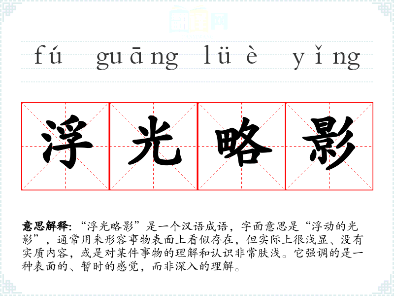 | 浮光略影 | 比喻观察不细致,学习不深入,印象不深刻。同“浮光掠影”。 |