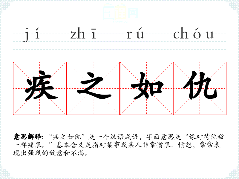 “疾之如仇”是一个汉语成语,字面意思是“像对待仇敌一样痛恨。”基本含义是指对某事或某人非常憎恨、愤怒,常常表现出强烈的敌意和不满。