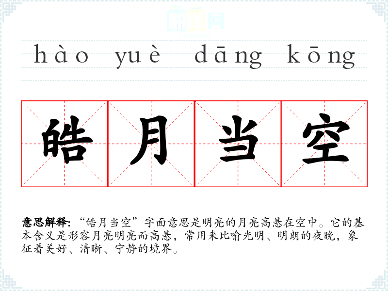 “皓月当空”字面意思是明亮的月亮高悬在空中。它的基本含义是形容月亮明亮而高悬,常用来比喻光明、明朗的夜晚,象征着美好、清晰、宁静的境界。