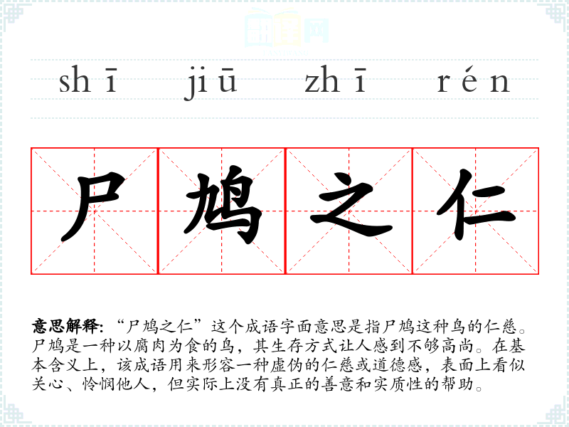 “尸鸠之仁”这个成语字面意思是指尸鸠这种鸟的仁慈。尸鸠是一种以腐肉为食的鸟,其生存方式让人感到不够高尚。在基本含义上,该成语用来形容一种虚伪的仁慈或道德感,表面上看似关心、怜悯他人,但实际上没有真正的善意和实质性的帮助。