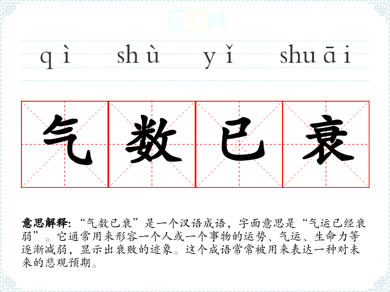 “气数已衰”是一个汉语成语,字面意思是“气运已经衰弱”。它通常用来形容一个人或一个事物的运势、气运、生命力等逐渐减弱,显示出衰败的迹象。这个成语常常被用来表达一种对未来的悲观预期。