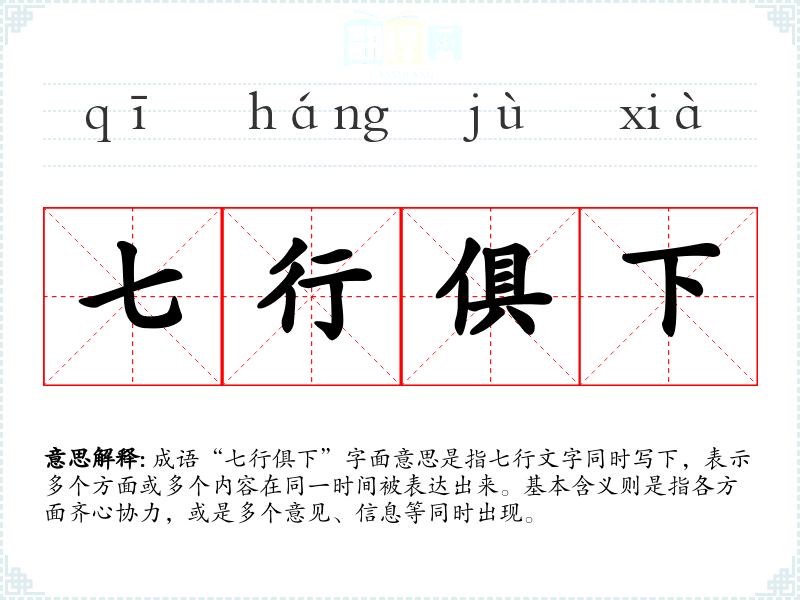 成语“七行俱下”字面意思是指七行文字同时写下,表示多个方面或多个内容在同一时间被表达出来。基本含义则是指各方面齐心协力,或是多个意见、信息等同时出现。