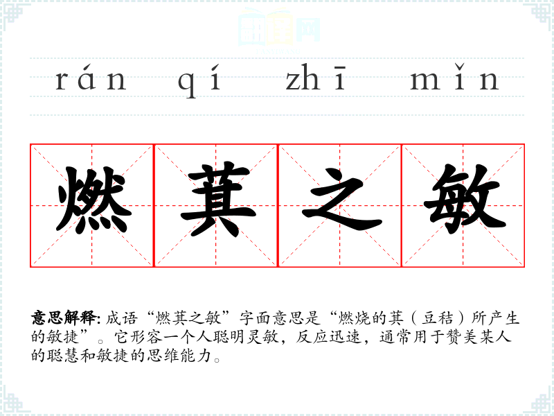 成语“燃萁之敏”字面意思是“燃烧的萁(豆秸)所产生的敏捷”。它形容一个人聪明灵敏,反应迅速,通常用于赞美某人的聪慧和敏捷的思维能力。
