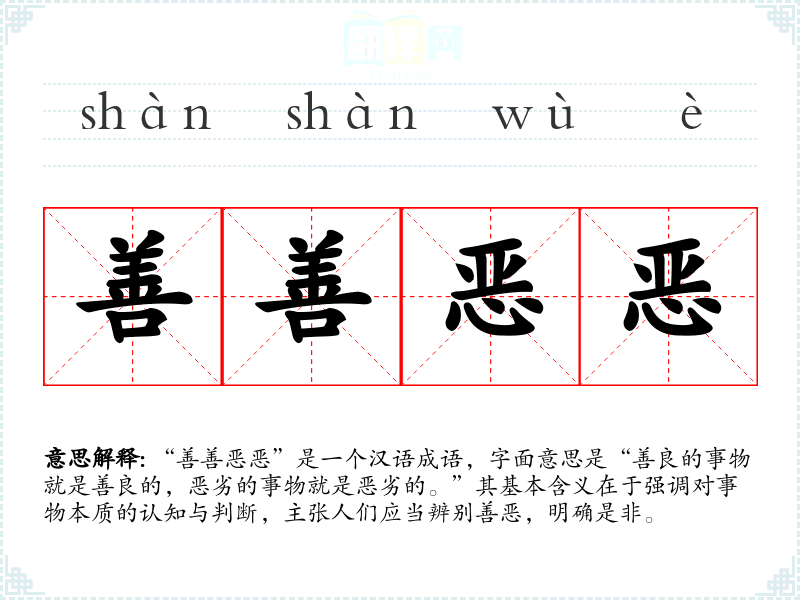 “善善恶恶”是一个汉语成语,字面意思是“善良的事物就是善良的,恶劣的事物就是恶劣的。”其基本含义在于强调对事物本质的认知与判断,主张人们应当辨别善恶,明确是非。