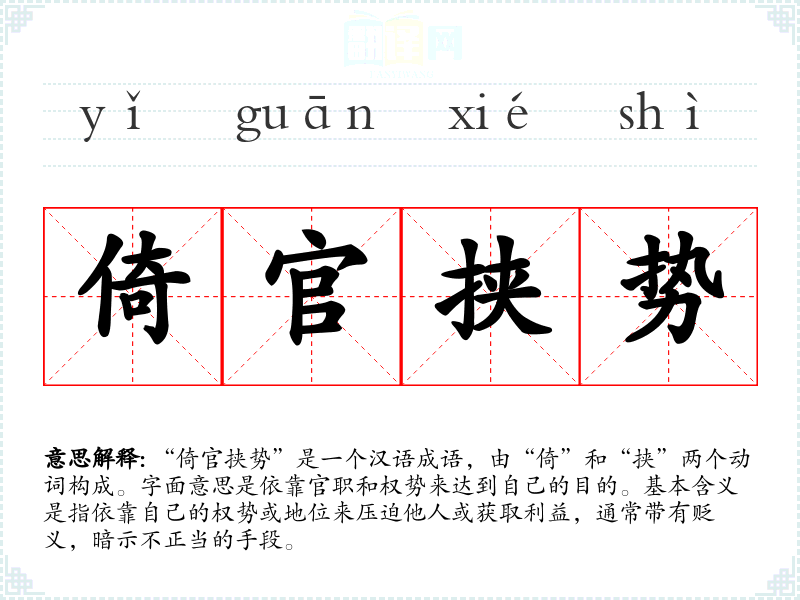 “倚官挟势”是一个汉语成语,由“倚”和“挟”两个动词构成。字面意思是依靠官职和权势来达到自己的目的。基本含义是指依靠自己的权势或地位来压迫他人或获取利益,通常带有贬义,暗示不正当的手段。