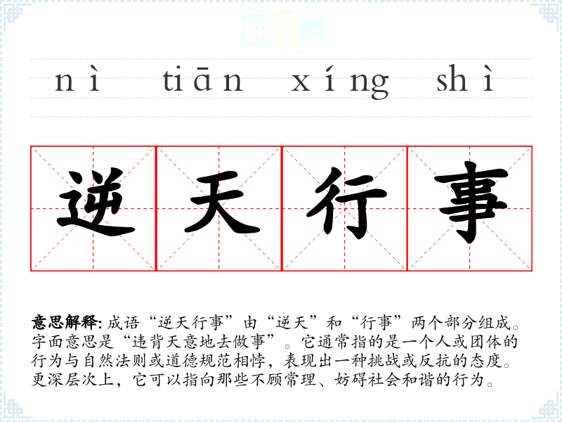 成语“逆天行事”由“逆天”和“行事”两个部分组成。字面意思是“违背天意地去做事”。它通常指的是一个人或团体的行为与自然法则或道德规范相悖,表现出一种挑战或反抗的态度。更深层次上,它可以指向那些不顾常理、妨碍社会和谐的行为。
