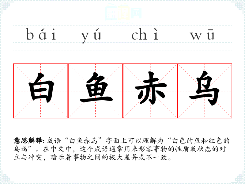 成语“白鱼赤乌”字面上可以理解为“白色的鱼和红色的乌鸦”。在中文中,这个成语通常用来形容事物的性质或状态的对立与冲突,暗示着事物之间的极大差异或不一致。