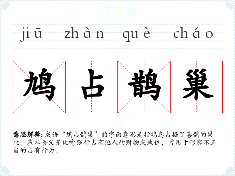 成语“鸠占鹊巢”的字面意思是指鸠鸟占据了喜鹊的巢穴。基本含义是比喻强行占有他人的财物或地位,常用于形容不正当的占有行为。