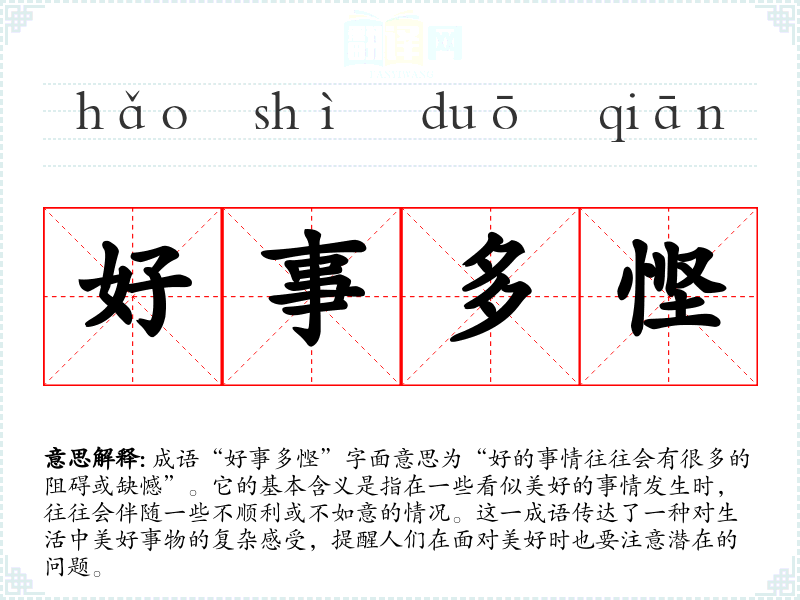 成语“好事多悭”字面意思为“好的事情往往会有很多的阻碍或缺憾”。它的基本含义是指在一些看似美好的事情发生时,往往会伴随一些不顺利或不如意的情况。这一成语传达了一种对生活中美好事物的复杂感受,提醒人们在面对美好时也要注意潜在的问题。