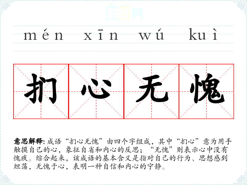 成语“扪心无愧”由四个字组成,其中“扪心”意为用手触摸自己的心,象征自省和内心的反思;“无愧”则表示心中没有愧疚。综合起来,该成语的基本含义是指对自己的行为、思想感到坦荡,无愧于心,表明一种自信和内心的宁静。