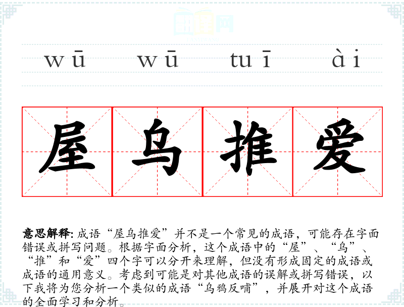 成语“屋乌推爱”并不是一个常见的成语,可能存在字面错误或拼写问题。根据字面分析,这个成语中的“屋”、“乌”、“推”和“爱”四个字可以分开来理解,但没有形成固定的成语或成语的通用意义。考虑到可能是对其他成语的误解或拼写错误,以下我将为您分析一个类似的成语“乌鸦反哺”,并展开对这个成语的全面学*和分析。