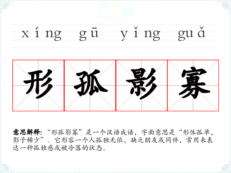 “形孤影寡”是一个汉语成语,字面意思是“形体孤单,影子稀少”。它形容一个人孤独无依,缺乏朋友或同伴,常用来表达一种孤独感或被冷落的状态。