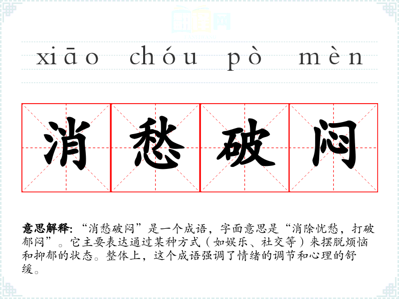 | 消愁破闷 | 消除忧愁,破除郁闷。 |