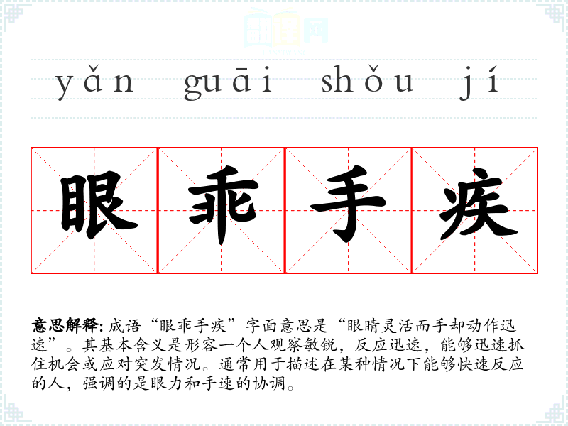 成语“眼乖手疾”字面意思是“眼睛灵活而手却动作迅速”。其基本含义是形容一个人观察敏锐,反应迅速,能够迅速抓住机会或应对突发情况。通常用于描述在某种情况下能够快速反应的人,强调的是眼力和手速的协调。