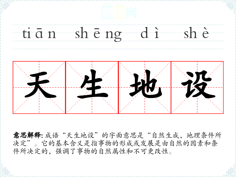 成语“天生地设”的字面意思是“自然生成,地理条件所决定”。它的基本含义是指事物的形成或发展是由自然的因素和条件所决定的,强调了事物的自然属性和不可更改性。