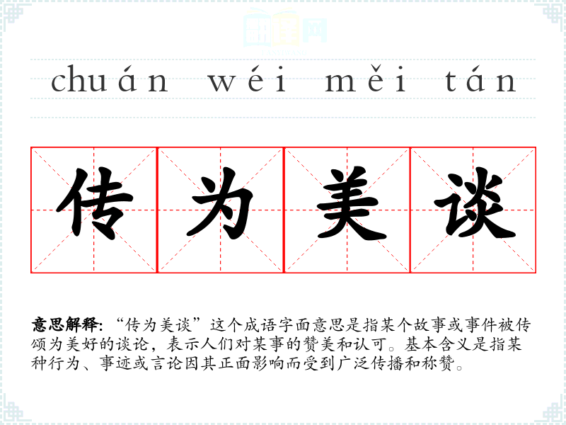| 传为佳话 | 指传扬开去,成为人们赞美、称颂的事情。 |