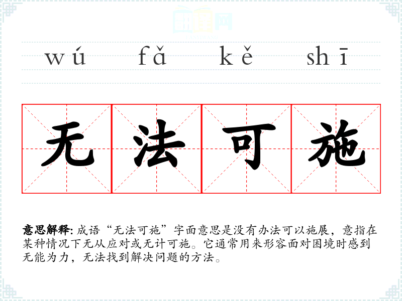 成语“无法可施”字面意思是没有办法可以施展,意指在某种情况下无从应对或无计可施。它通常用来形容面对困境时感到无能为力,无法找到解决问题的方法。