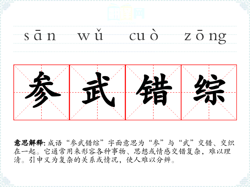 成语“参武错综”字面意思为“参”与“武”交错、交织在一起。它通常用来形容各种事物、思想或情感交错复杂,难以理清。引申义为复杂的关系或情况,使人难以分辨。