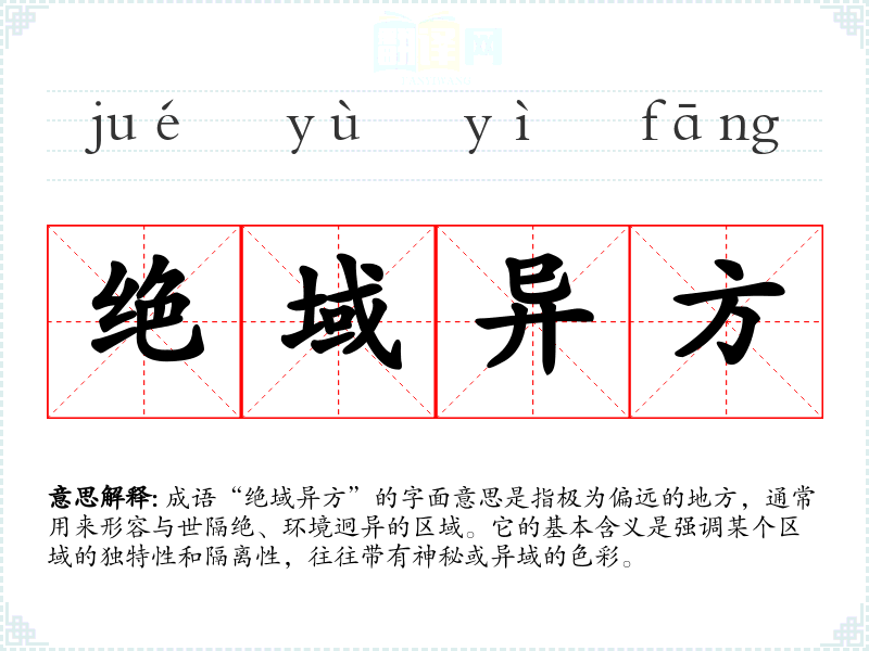 成语“绝域异方”的字面意思是指极为偏远的地方,通常用来形容与世隔绝、环境迥异的区域。它的基本含义是强调某个区域的独特性和隔离性,往往带有神秘或异域的色彩。