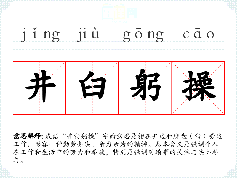 成语“井臼躬操”字面意思是指在井边和磨盘(臼)旁边工作,形容一种勤劳务实、亲力亲为的精神。基本含义是强调个人在工作和生活中的努力和奉献,特别是强调对琐事的关注与实际参与。