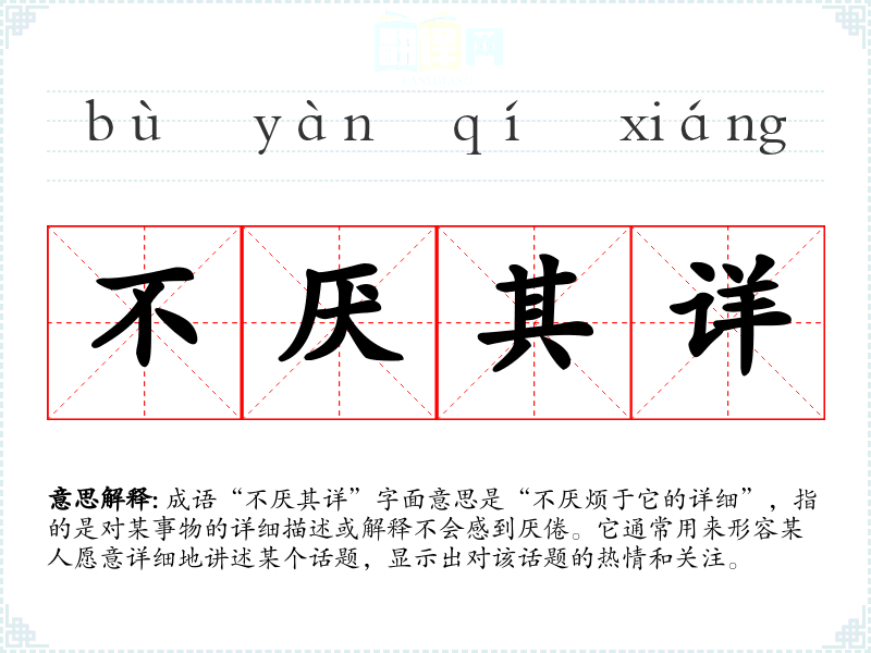 成语“不厌其详”字面意思是“不厌烦于它的详细”,指的是对某事物的详细描述或解释不会感到厌倦。它通常用来形容某人愿意详细地讲述某个话题,显示出对该话题的热情和关注。