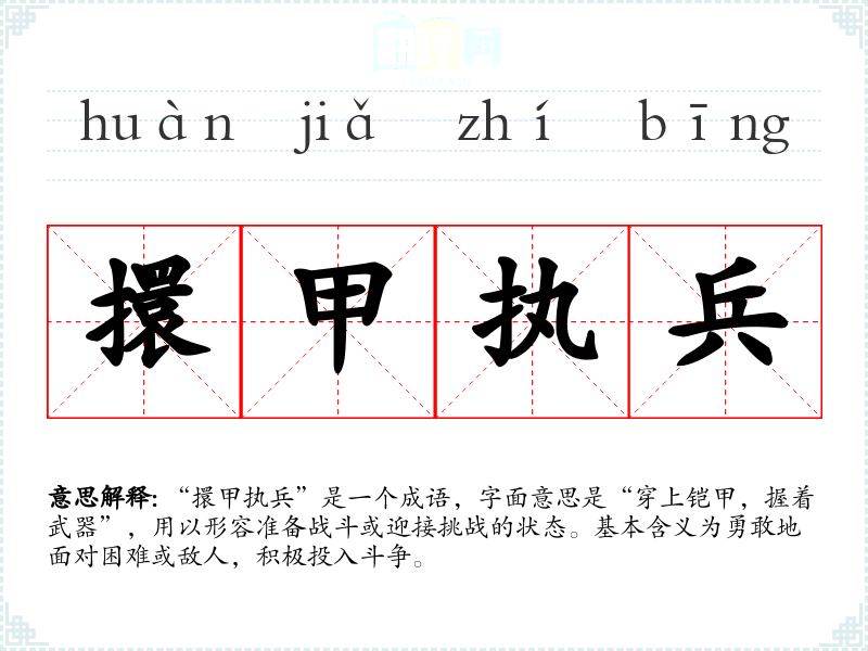 “擐甲执兵”是一个成语,字面意思是“穿上铠甲,握着武器”,用以形容准备战斗或迎接挑战的状态。基本含义为勇敢地面对困难或敌人,积极投入斗争。