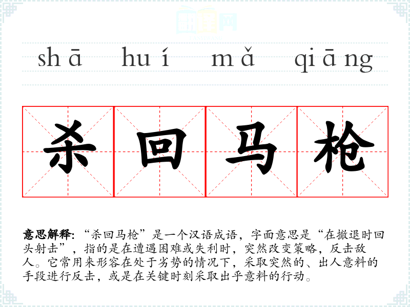 在英语中,类似的表达可能是“turn the tables”或“counterattack”,同样传达了在不利情况下反击的意义。然而,成语“杀回马枪”更强调出乎意料和灵活应对的策略,体现了**文化中对智慧与勇气的重视。