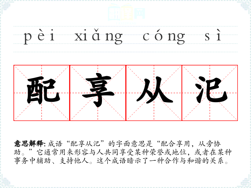成语“配享从汜”的字面意思是“配合享用,从旁协助。”它通常用来形容与人共同享受某种荣誉或地位,或者在某种事务中辅助、支持他人。这个成语暗示了一种合作与和谐的关系。