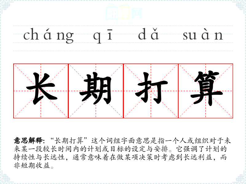 “长期打算”并不是一个传统的成语,它更多是现代汉语中常用的词组。这个词组可以看作是对“打算”这一行为的时间维度的延展,反映了现代社会中人们对于规划、预见和持续努力的重视。