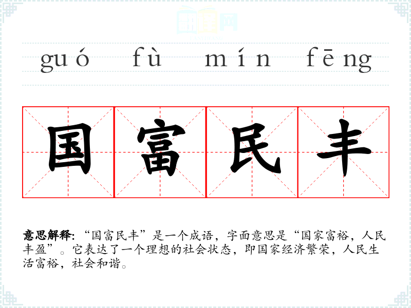 “国富民丰”是一个成语,字面意思是“国家富裕,人民丰盈”。它表达了一个理想的社会状态,即国家经济繁荣,人民生活富裕,社会和谐。