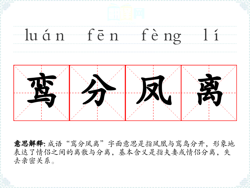 成语“鸾分凤离”字面意思是指凤凰与鸾鸟分开,形象地表达了情侣之间的离散与分离,基本含义是指夫妻或情侣分离,失去亲密关系。