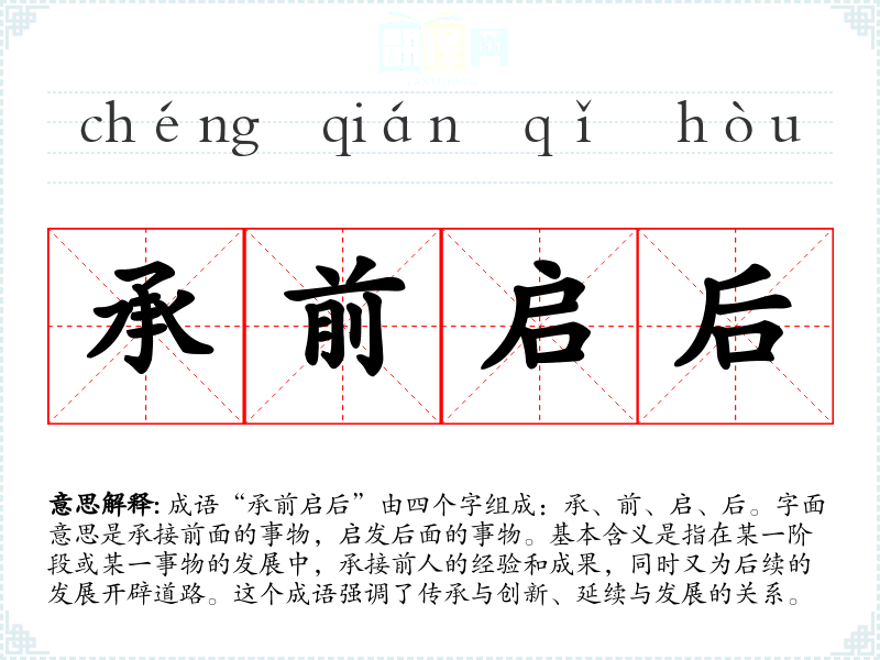 | 承前启后 | 承:承接;启:开创。承接前面的,开创后来的。指继承前人事业,为后人开辟道路。 |