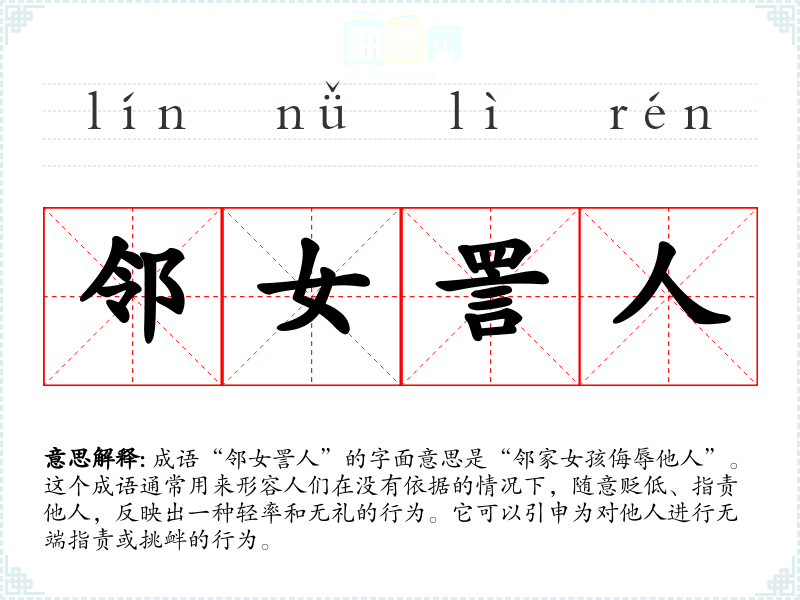 成语“邻女詈人”的字面意思是“邻家女孩侮辱他人”。这个成语通常用来形容人们在没有依据的情况下,随意贬低、指责他人,反映出一种轻率和无礼的行为。它可以引申为对他人进行无端指责或挑衅的行为。