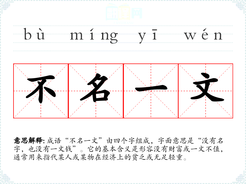 成语“不名一文”由四个字组成,字面意思是“没有名字,也没有一文钱”。它的基本含义是形容没有财富或一文不值,通常用来指代某人或某物在经济上的贫乏或无足轻重。