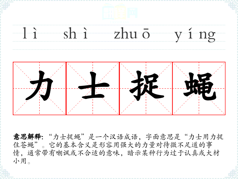 “力士捉蝇”是一个汉语成语,字面意思是“力士用力捉住苍蝇”。它的基本含义是形容用强大的力量对待微不足道的事情,通常带有嘲讽或不合适的意味,暗示某种行为过于认真或大材小用。