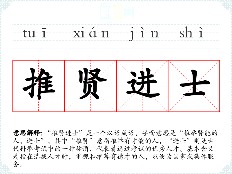 “推贤进士”源于古代**的科举制度,强调选拔和重用贤能之士。历史上,许多朝代都设有科举考试,通过考试选拔出大量的进士,这些人往往在政治、文化等领域发挥重要作用。成语的使用反映了古人对人才的重视和对贤能之士的推崇。