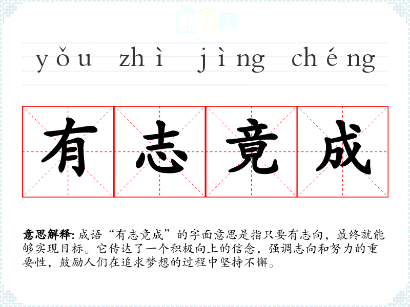 成语“有志竟成”的字面意思是指只要有志向,最终就能够实现目标。它传达了一个积极向上的信念,强调志向和努力的重要性,鼓励人们在追求梦想的过程中坚持不懈。