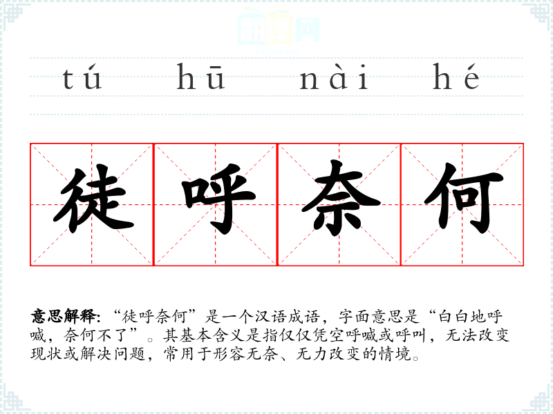 “徒呼奈何”是一个汉语成语,字面意思是“白白地呼喊,奈何不了”。其基本含义是指仅仅凭空呼喊或呼叫,无法改变现状或解决问题,常用于形容无奈、无力改变的情境。