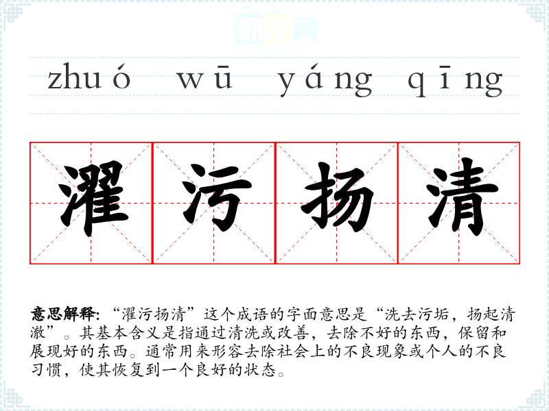 “濯污扬清”这个成语的字面意思是“洗去污垢,扬起清澈”。其基本含义是指通过清洗或改善,去除不好的东西,保留和展现好的东西。通常用来形容去除社会上的不良现象或个人的不良*惯,使其恢复到一个良好的状态。